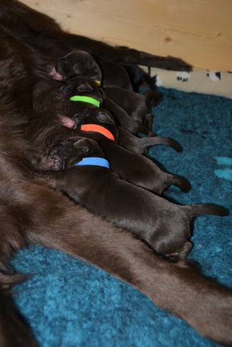 Der G-Wurf: 4 Hündinnen braun, 1 Hündin schwarz, 6 Rüden braun & 1 Rüde schwarz