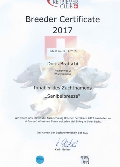 Das Breeders Certificate wurde dank den Gesundheitsresultaten und Weiterbildung meinerseits wieder erneuert - danke an alle Welpenkäufer die die erforderlichen Gesundheitschecks haben machen lassen - DANKE