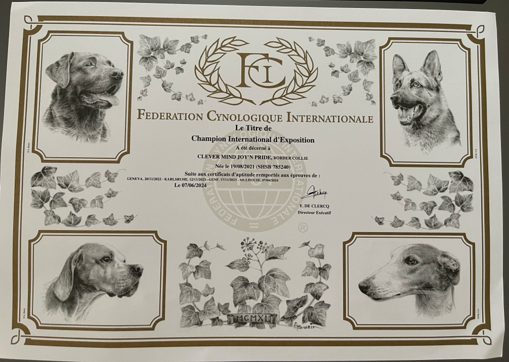 HURRA die Urkunde von der FCI ist eingetroffen! Joy wurde offiziell der Titel "CHAMPION INTERNATIONAL D' EXPOSITION erteilt - Joy wurde in der