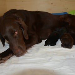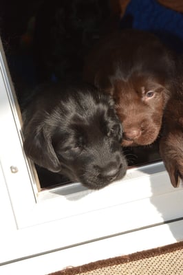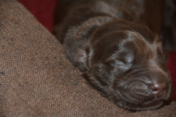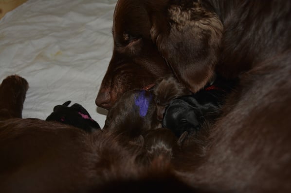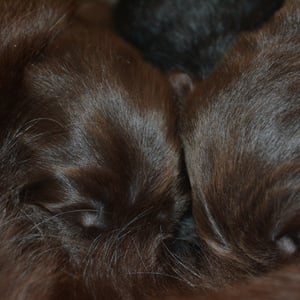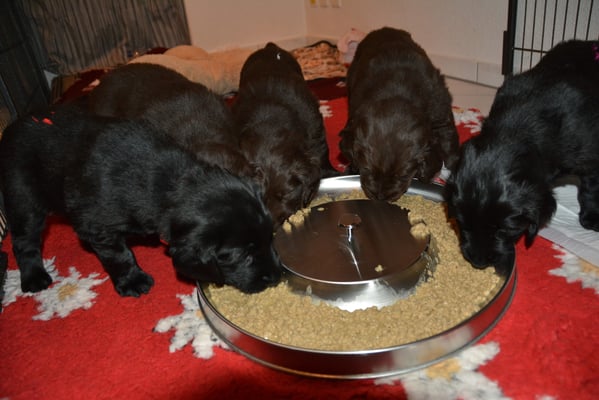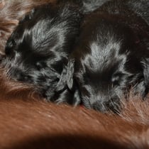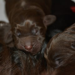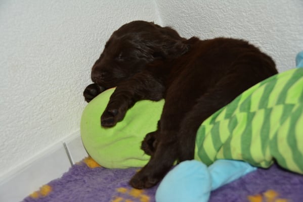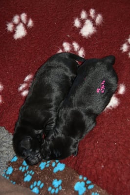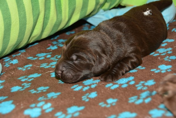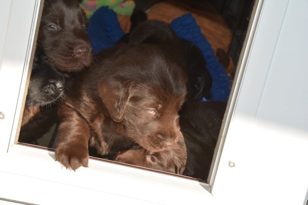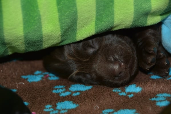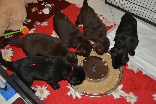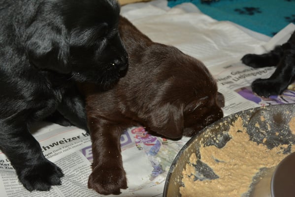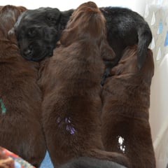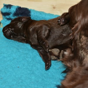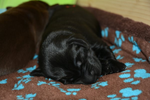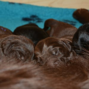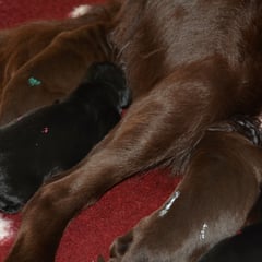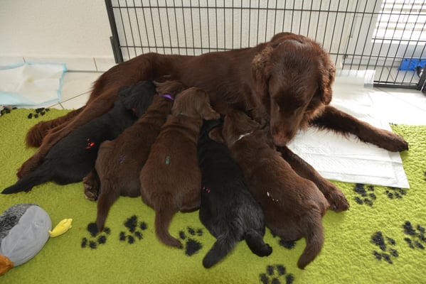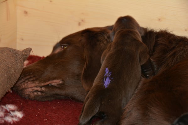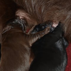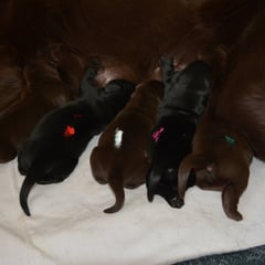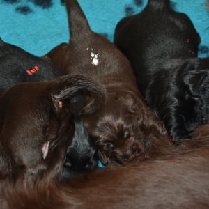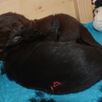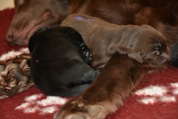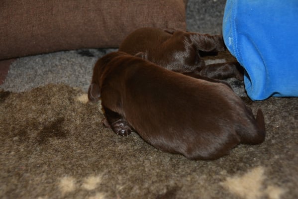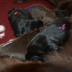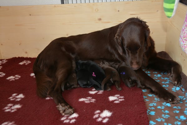 Es sind 1 schwarze Hündin, 2 braune Hündinnen, 1 schwarzer und ein brauner Rüde. Den Fünfen geht's gut sie trinken und schlafen und nehmen schön an Gewicht zu.