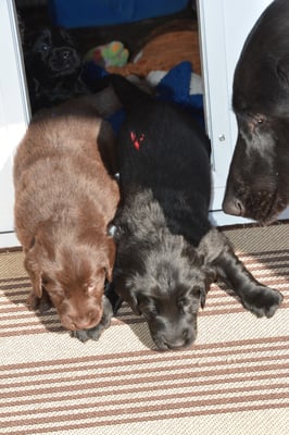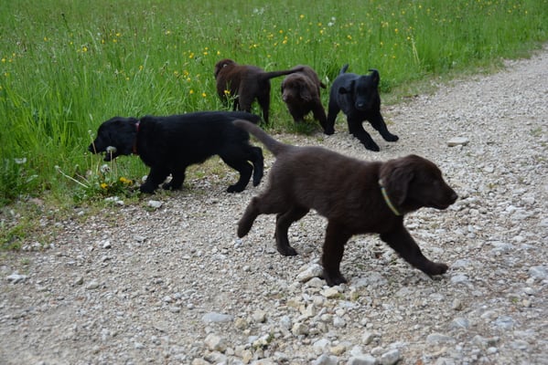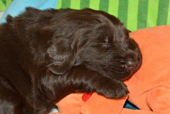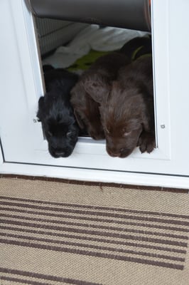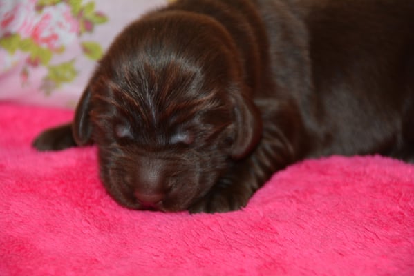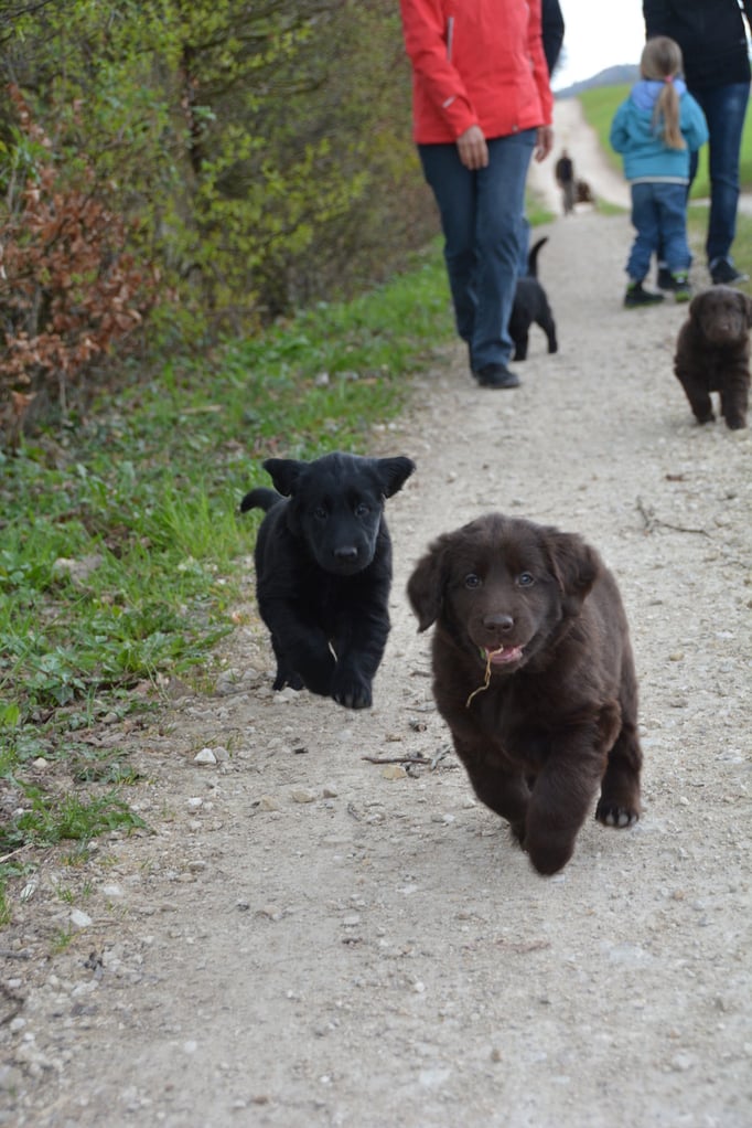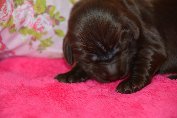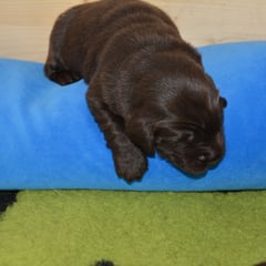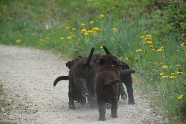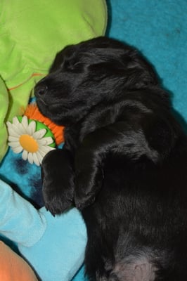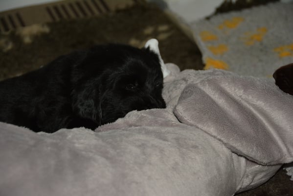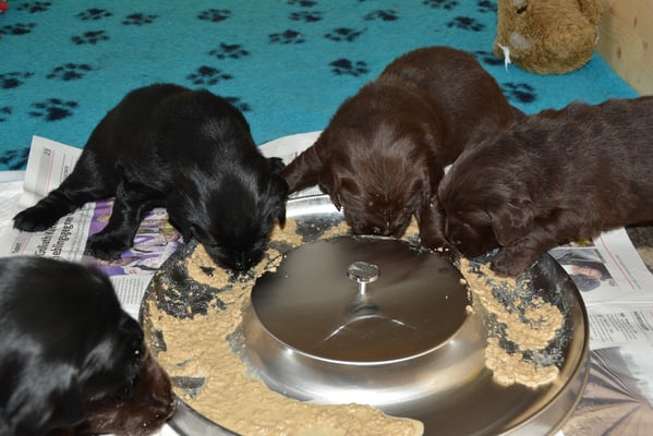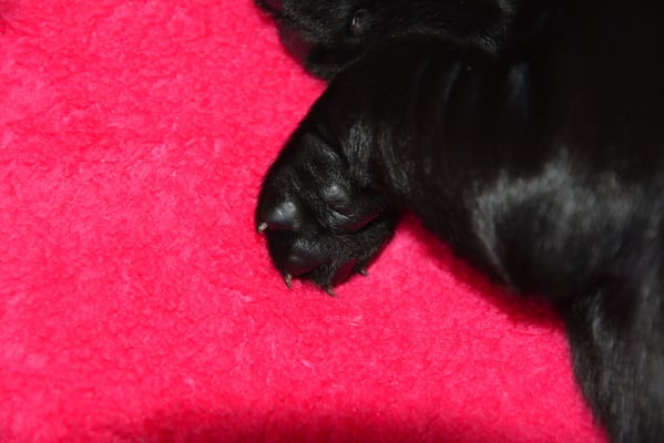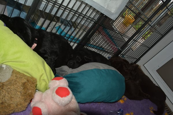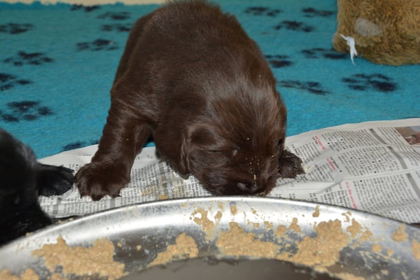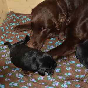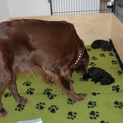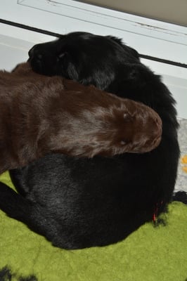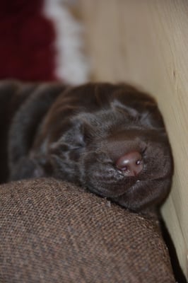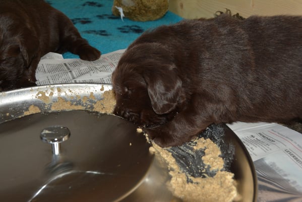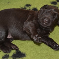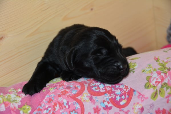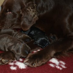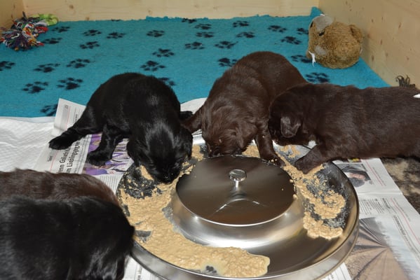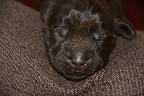 Es sind 1 schwarze Hündin, 2 braune Hündinnen, 1 schwarzer und ein brauner Rüde. Den Fünfen geht's gut sie trinken und schlafen und nehmen schön an Gewicht zu.