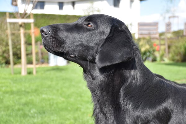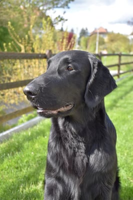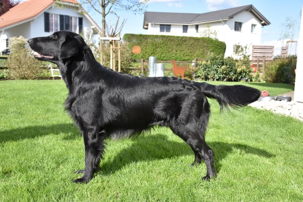 7.5 monatiger kräftiger Jungrüde mit korrektem Kopf und Ausdruck, sehr gute Hals und Rückenlinie, kräftige Brust korrekt gestellt, sollte nicht mehr an Gewicht zulegen, freundliches