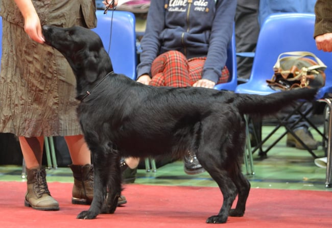 Nine and a half year old black bitch.pleasing type with feminine head and expression. Well placed shoulders, good bone and racy body. Correct second thigh and turn of stifle. Level topline and moved well, excellent