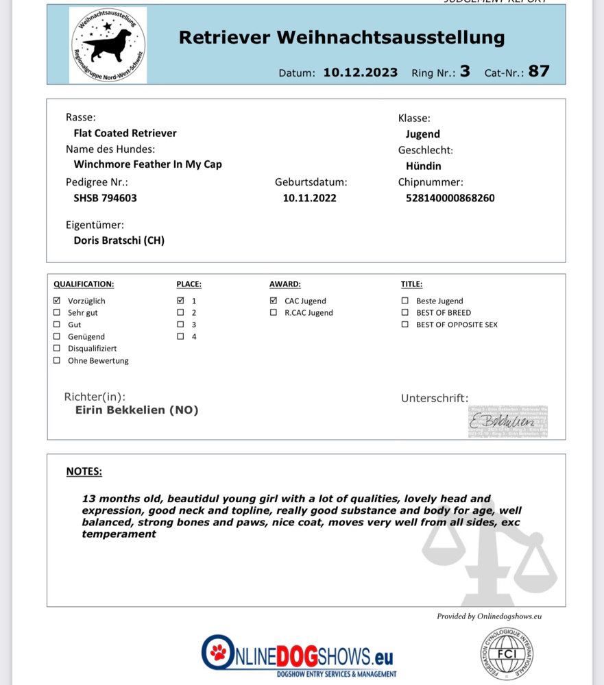Veerle gewinnt die stark besetzte Jugendklasse mit vorzüglich 1 CAC und erhält einen tollen Richterbericht
